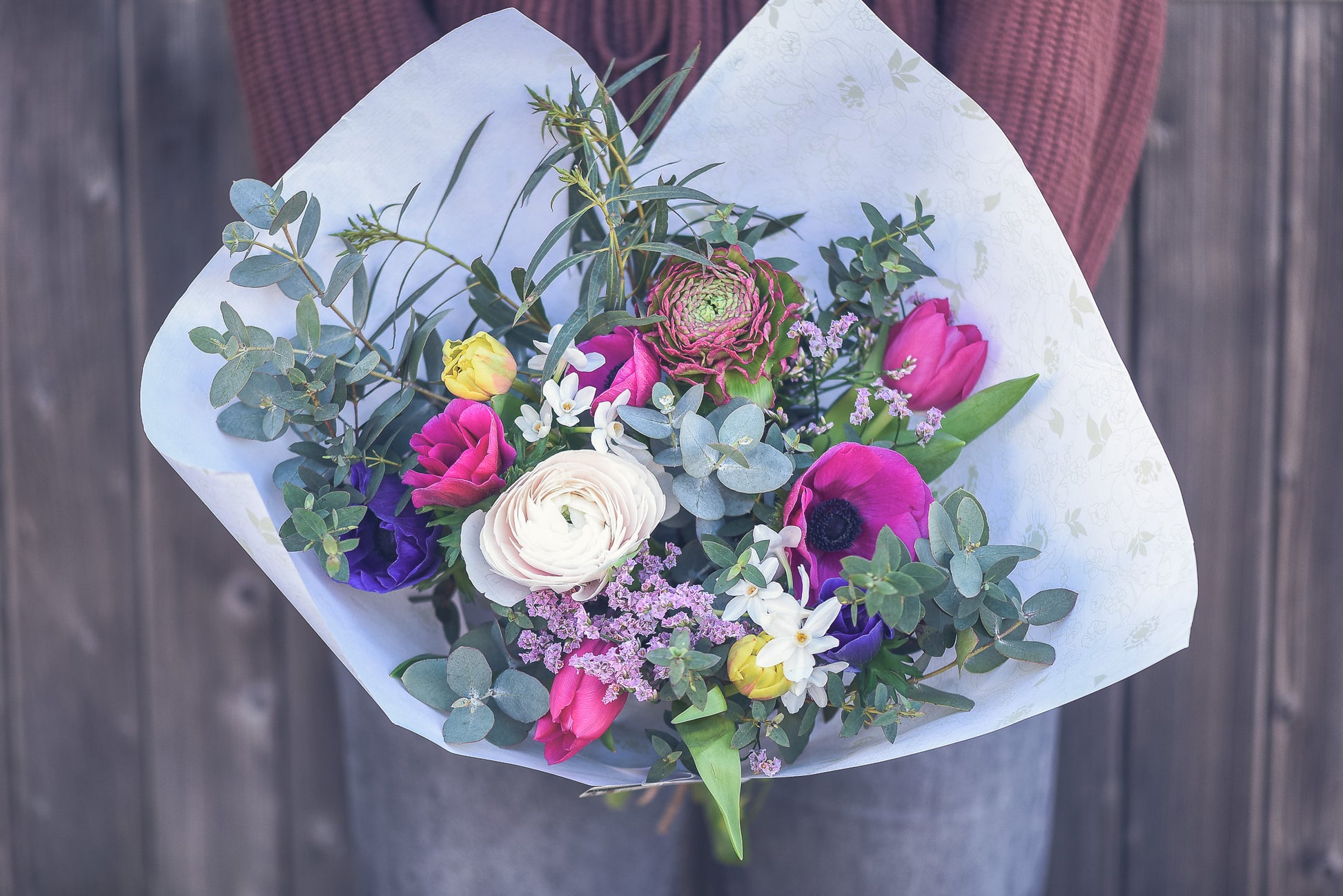 Selon la saison votre bouquet aura des fleurs adapté. Vous retrouverez par exemple les tulipes, anémones, renoncules, Jacinthes, Narcisses, pivoines, roses...